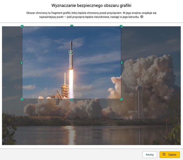 W ramach obszaru chronionego, możliwe jest oznaczenie najważniejszego punktu. Jeśli niezbędne będzie przycięcie grafiki, nastąpi ono w jego kierunku. Aby zmienić położenie najważniejszego punktu, kliknij na przycisk "Obszar chroniony" w szczegółach pliku, a następnie chwyć punkt chroniony i przeciągnij z pożądane miejsce.