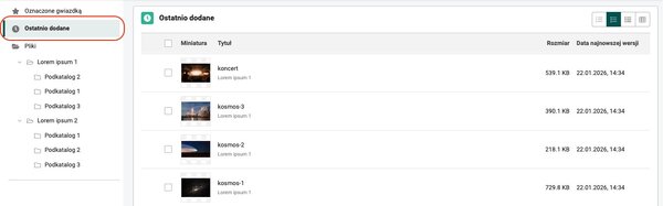 W zakładce "Ostatnio dodane" możesz przeglądać ostatnio dodane pliki do danego komponentu Plików. Dzięki temu możesz szybko zrewidować komponent oraz przenieść wybrane pliki do wszyskich docelowych folderów, w których mają się znaleźć.